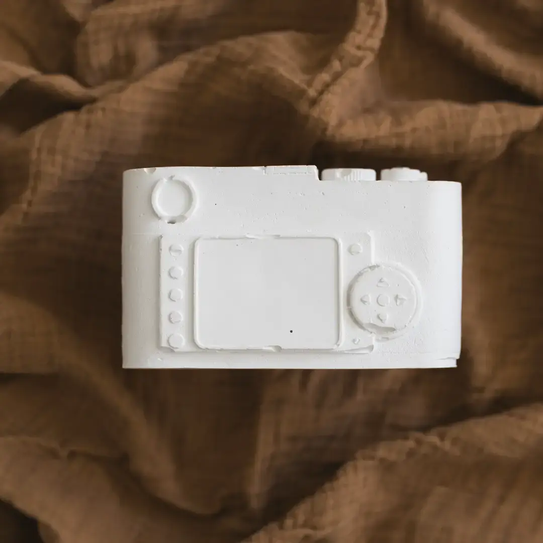 Unsere Kamera besteht aus einer Kombination aus neuem und recyceltem Gips und wird mit viel Liebe zum Detail gefertigt. Jedes Stück ist ein Unikat, das durch seine individuelle Oberflächenstruktur und feine Gipsdetails besticht.